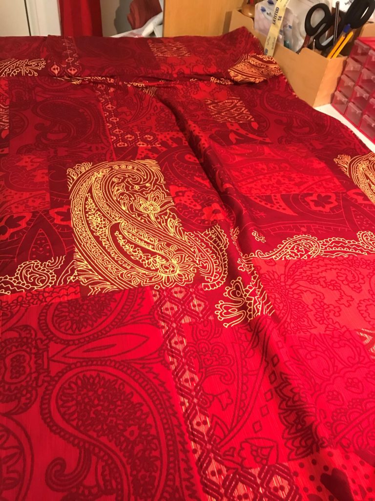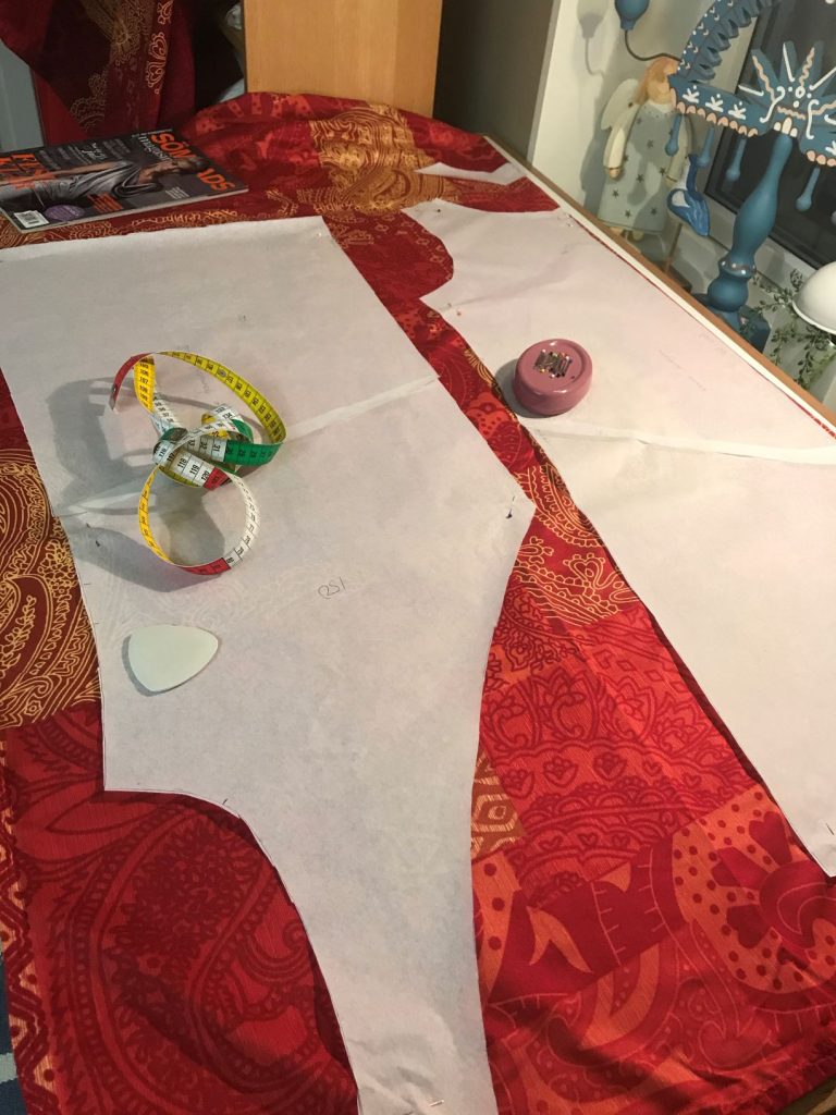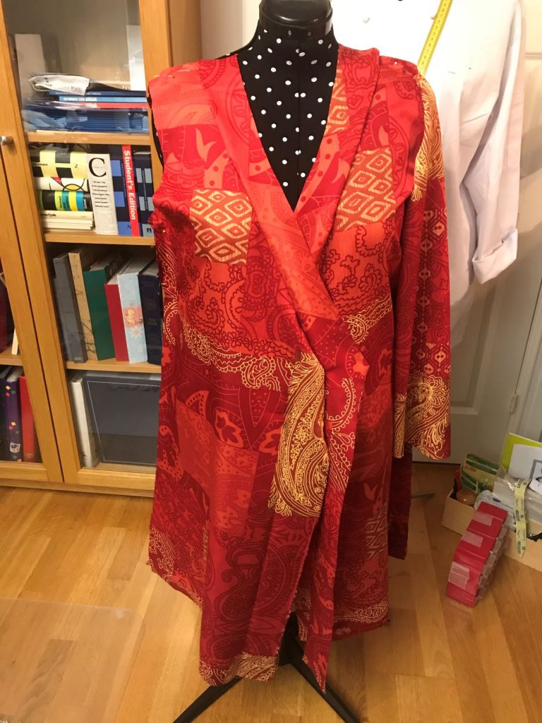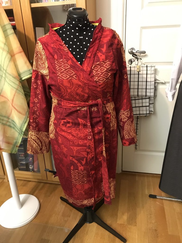 Vår granne i Korpis, hade sett några av mina projekt från syateljén på Instagram, Latitud56_h3. Vi kan kalla henne för vår ”husläkare” för hon har ett hus och är läkare. Vår husläkare hade nog höga tankar om min sömnadsskicklighet. För en dag i mars kom det ett meddelande att hon ville att jag skulle sy upp en kimono, med tillhörande byxor som skulle kunna användas som pyjamas. Vi träffas inte så ofta eftersom hon jobbar i ett annat skandinaviskt land. Men till påsk skulle hon komma till Korpis. Eftersom jag arbetar på dagtid med helt andra saker än sömnad, får syateljén hållas öppen på kvällar och helger.