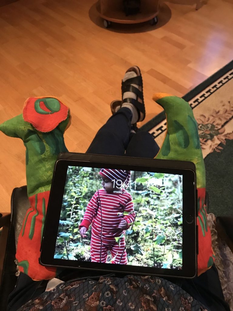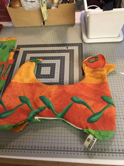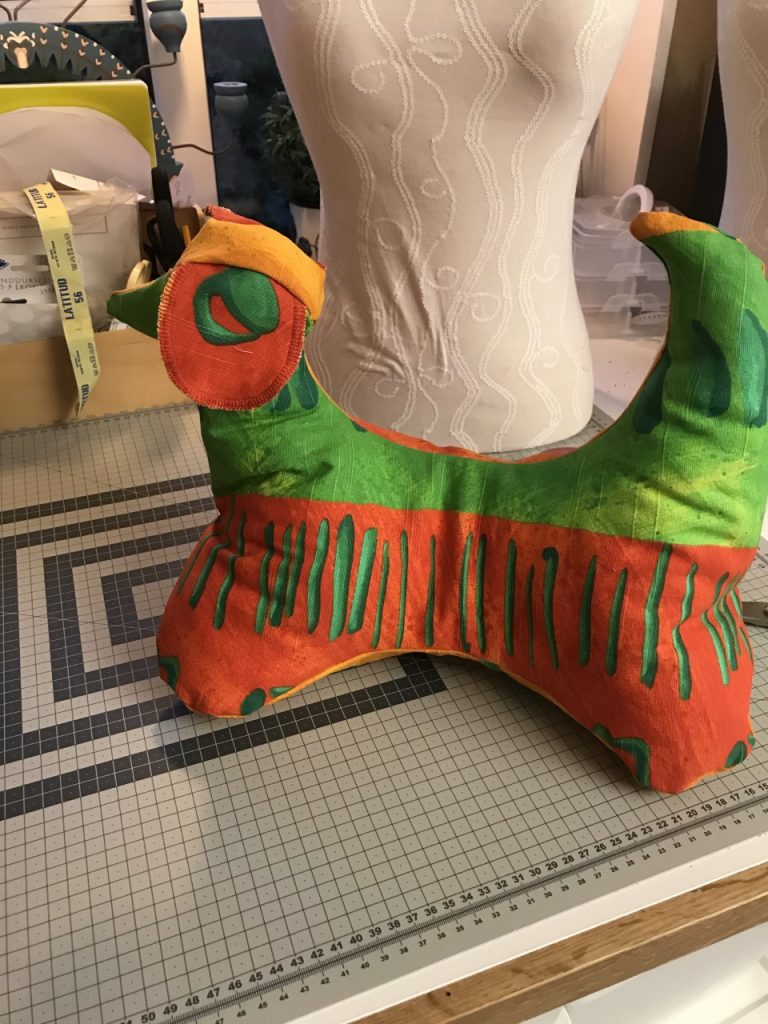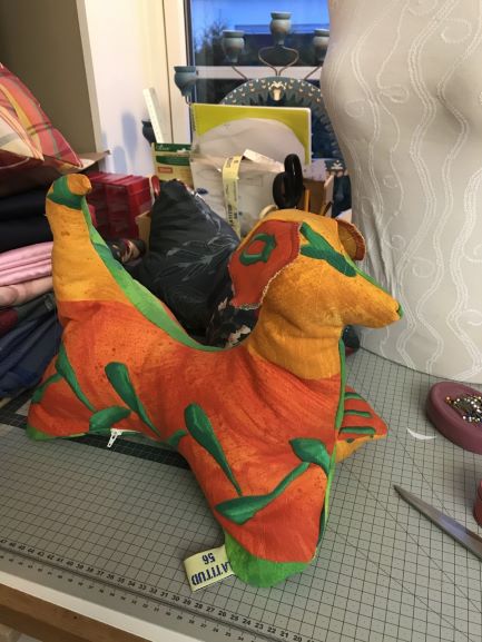 Hur svårt kan det vara? Jag var ute på nätet och tittade runt på olika varianter av läskuddar. Men jag fick inga direkta idéer om hur jag skulle ta mig an uppgiften. Men så såg jag nackkudden som jag sytt till min syster. Nackkudden såg ut som ett kraftigt hundben. När hundbenet stod på tillskärningsbordet så såg jag att det såg ut som en hund, eller snarare som en hund med kuperad svans och avsaknad av ett huvud. Där satt den! Läskudden skulle bli en Lathund/Läshund, en hund som hjälper en att hålla uppe en bok eller en padda. Jag började rita om mönstret och prövade mig fram för att få till en svans och ett huvud med öron. När jag var nöjd med mönsterskapandet så dök jag ner i tyghögarna. Det började närma sig påsk och vår. Jag plockade fram ett färgglatt tyg som skulle sätta piff på en läskudde när vårsolen tittar fram. Jag ritade och klippte till en Lathund med med både svans, huvud och öron. Det blev till och med en dragkedja för att enkelt kunna fylla hunden med stoppning när alla sömmar var klara. Lathunden levererades lagom till påsk och gotländskan har numera ett bokstöd i form av en Lathund.