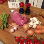 1 kg biff 1 paket bacon 2 schalottenlökar 4 morötter 4 dl vatten 4 dl rött vin 2 tärningar mörk oxbuljong 2 vitlöksklyftor 10 champinjoner Salt, peppar och färsk timjan Skär kött, lök, bacon, morötter och champinjoner i bitar. Bryn ingredienserna lite i taget i en stekgryta. Krydda med salt och peppar. Pressa vitlöken och …